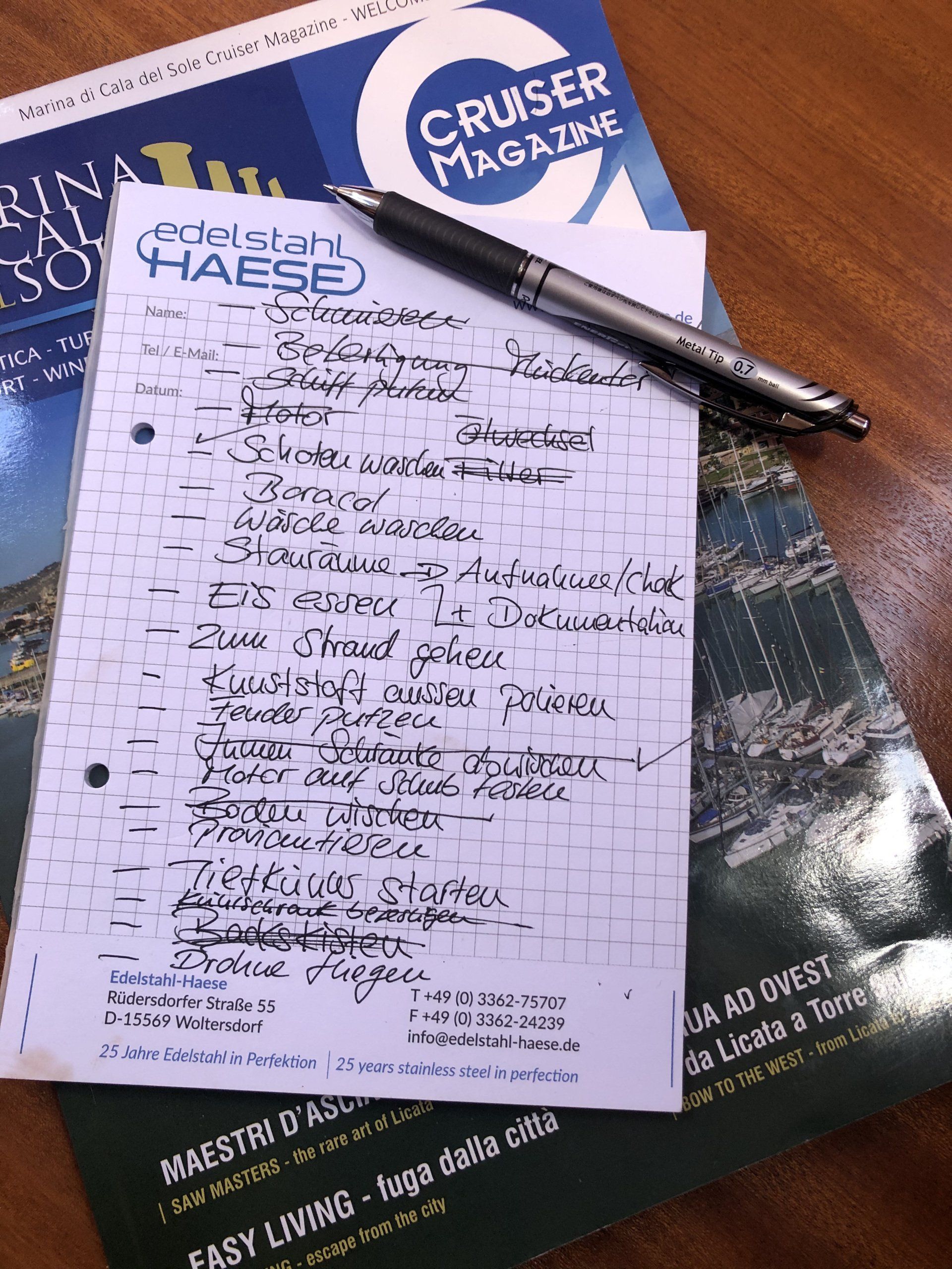 Und ab dann heisst es – Schiff putzen, einräumen, proviantieren, Servicearbeiten- und startklar machen. Denn wir wollen raus, aufs offene Wasser. Insgesamt dauert es dann aber doch fast zwei Wochen bis wir wirklich starten. Zum einen gab es ein paar Dinge am Boot zu tun, zum anderen waren wir auch schnell wieder Teil der Gemeinschaft in Licata und wollten Zeit mit den Menschen dort verbringen, die es im Sommer in alle Winde zerstreuen würde. Die haben sich zum Beispiel die Zeit mit Limoncello brauen vertrieben- und der muss ja dann in Respekt der Leistung auch in Ruhe verprobt werden.