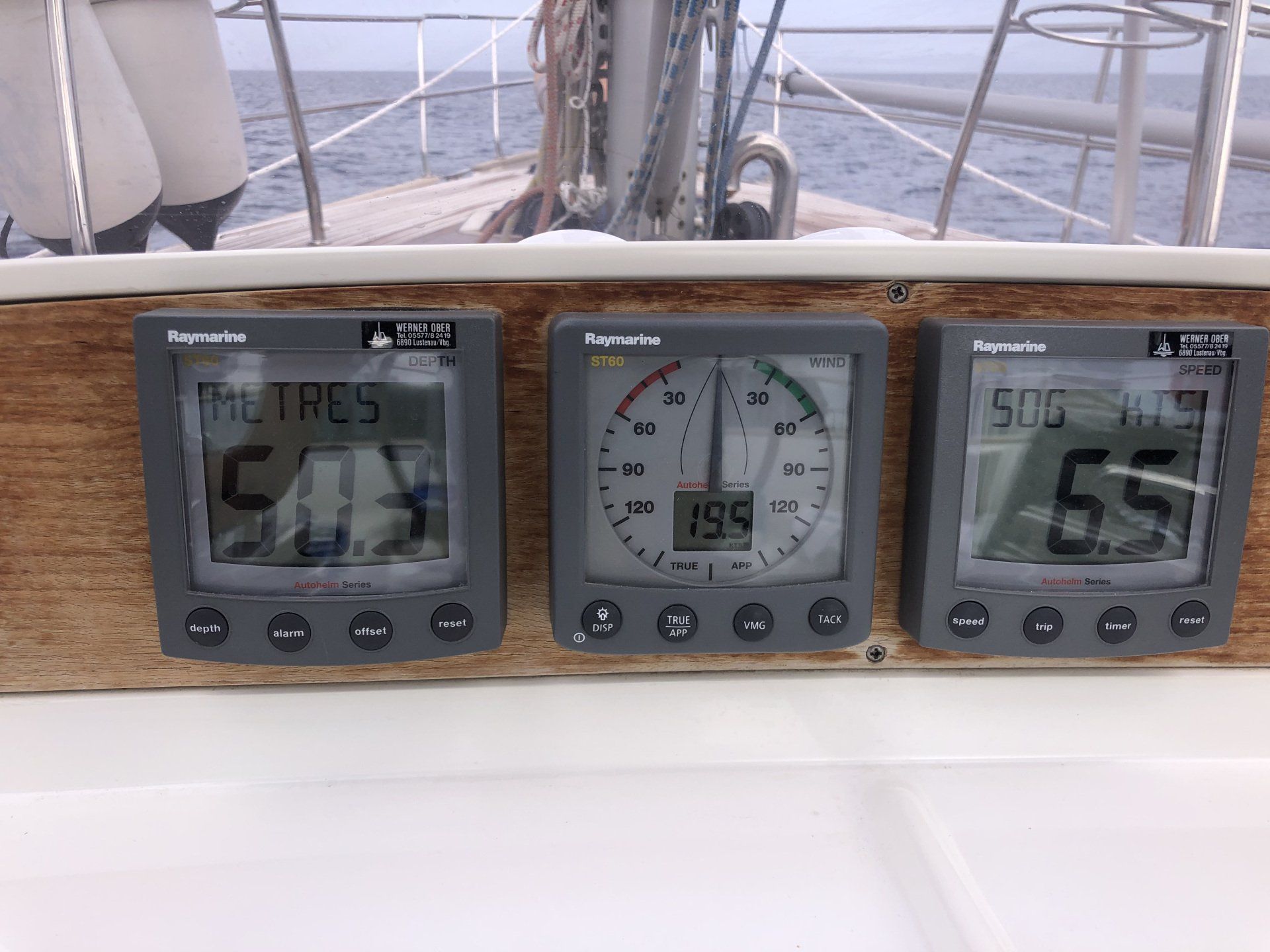 Am Ende der Strecke kommt laut Plan etwas mehr Wind, das müssen wir beobachten. Wir hoffen dass wir vor dem Windfenster durchhuschen. Das bedeutet aber wir müssen etwas schneller als die 5 Knoten sein…