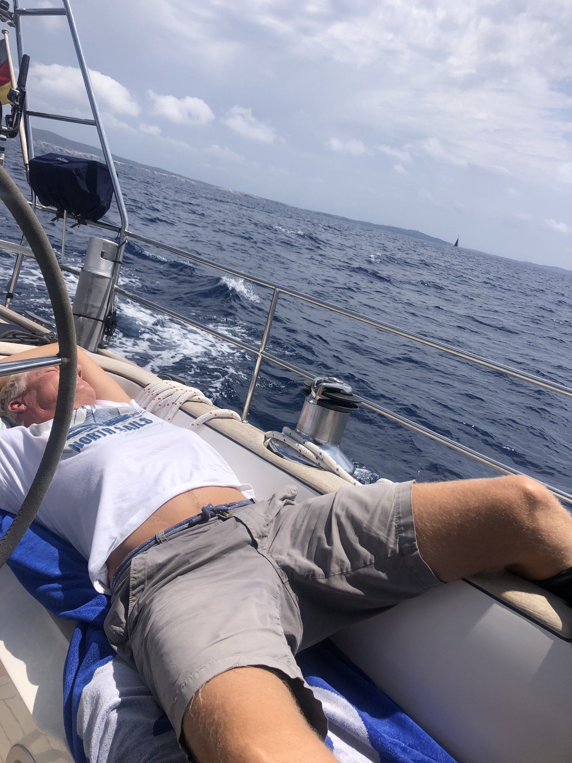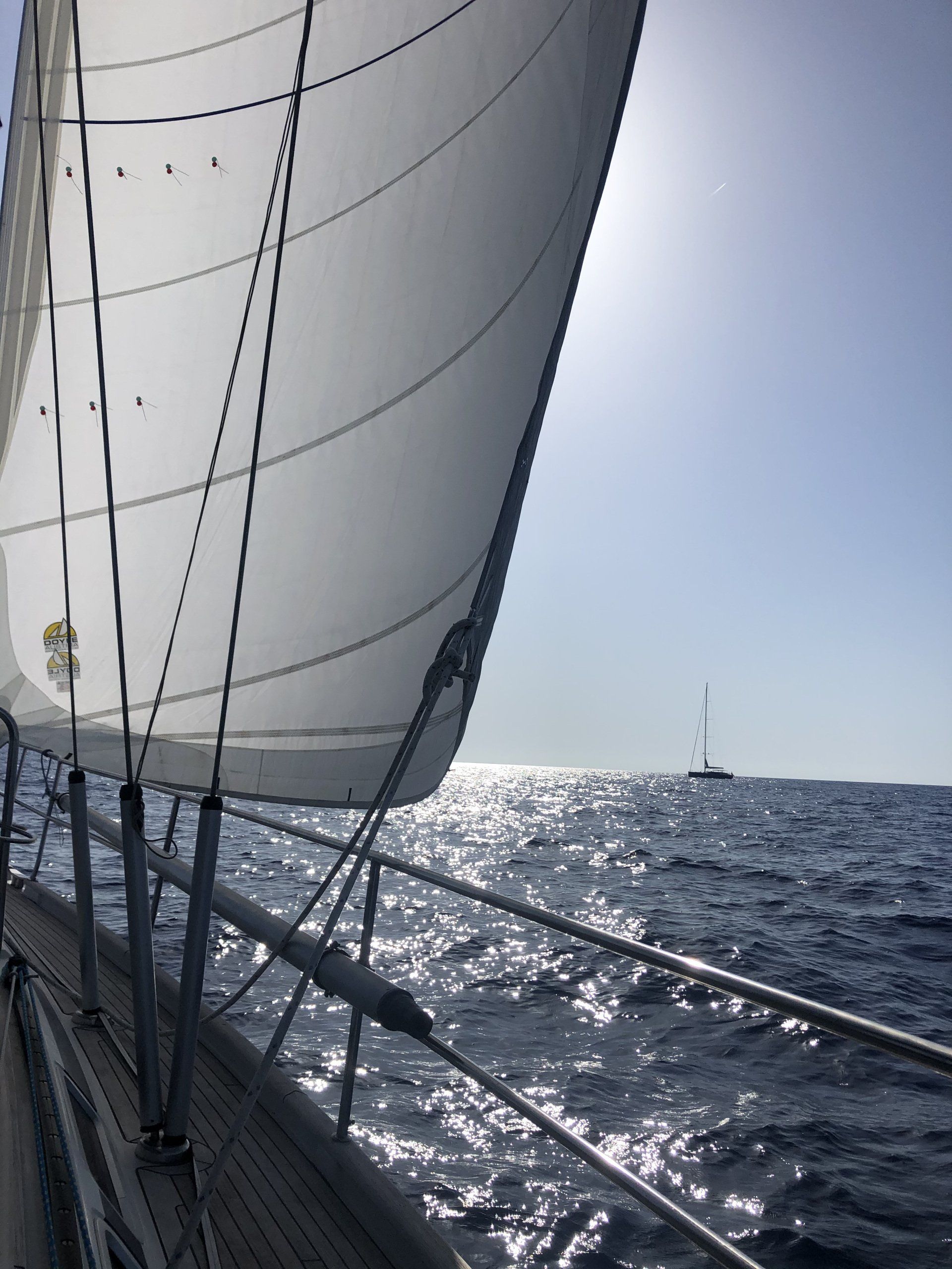 Wir legen Kurs an Richtung Cartagena. Jetzt kommt erstmal viel viel Wasser, bis wir seitlich an Mallorca vorbeisegeln wollen. Statt 12 Knoten Wind von hinten haben wir 20 Knoten von vorne. Aber das kennen wir ja schon. Nachmittags können wir dann endlich die Segel rausholen. Dieser Moment wenn der Motor ausgeht ist einfach himmlisch. Nach einer Stunde ist aber schon wieder Essig- der Wind hat uns ganz verlassen.