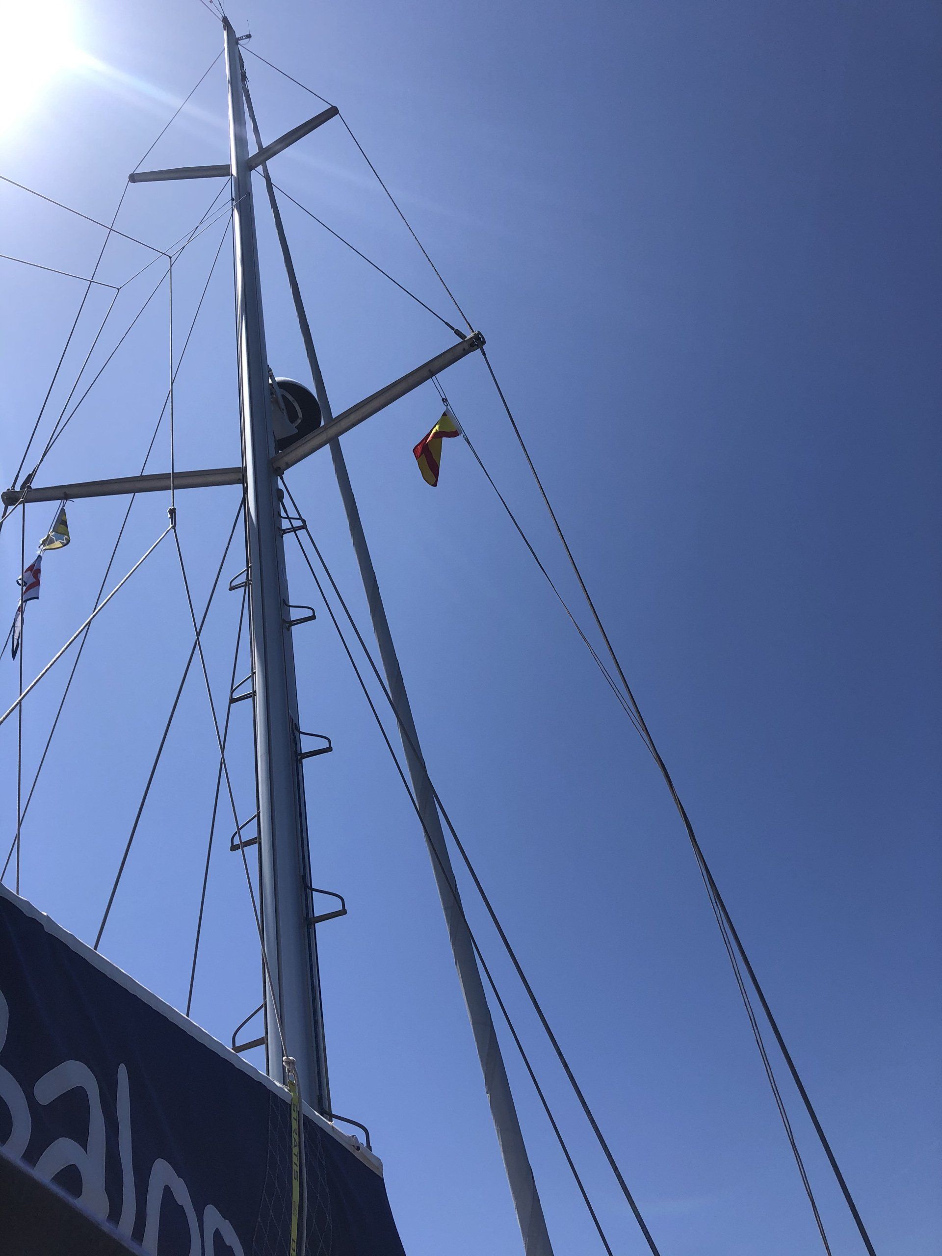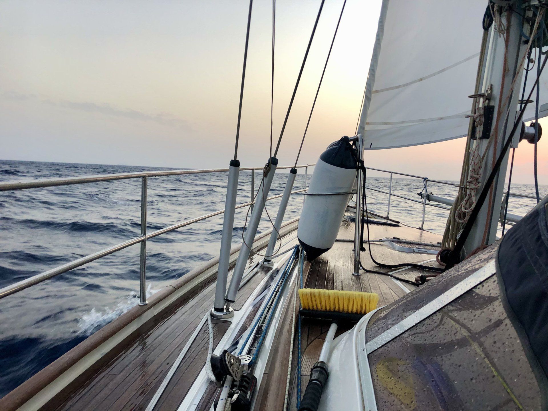 Die Sonne geht gerade unter, da haben wir die Idee, die Genua auszubaumen. Das bedeutet dass die Genua, vereinfacht gesagt, durch einen zusätzlichen Baum (lange Alustange, die im rechten Winkel vom Mast seitlich wegsteht) stabilisiert wird. Das ist besonders dann wichtig, wenn die Welle das Boot so bewegt, dass das Segel sonst immer wieder ins sich zusammenfällt. Denn das geht aufs Bootsmaterial, sprich das Segel, aber auch an die Nerven der menschlichen Bootsausrüstung. Sonnenuntergang ist, falls ich Tipps geben darf, dafür kein optimaler Zeitpunkt. Denn nach Untergang kommt dunkel. Wir müssen uns also beeilen. Zudem wackelt es durch die jetzt seitliche Welle ordentlich. Nicht ganz einfach da am Vordeck zu arbeiten. Und es passiert natürlich, was nicht passieren soll- der Schäkel, der den Baum hochzieht, ist nicht ganz geschlossen und löst sich. Das Fall also (die Leine), an dessen Ende der Schäkel ist, wird kräftig nach oben gezogen – nur ohne den Baum dran. Und zwar so hoch dass wir nicht mehr drankommen. Leinen gehen durch den Mast innen nach oben und kommen dann oben wieder raus, gehen dann außen bis zum Deck wieder runter. Dadurch kann man Dinge hochziehen. Wenn die Leine auskommt hat man ein Problem- der Schäkel hat nicht genug Gewicht um die Leine wieder runter zu ziehen. Unser Fall baumelt jetzt in ca 10 Metern Höhe rum. Das bedeutet nur eins- Guido muss in den Mast hoch und das Fall wieder holen. Also Klettergurt an, und ich ziehe Guido mit der elektrischen Winschkurbel hoch. Fast schon Routine. Allerdings beinhaltet unsere Routine keine seitliche Welle. Guido muss sich also ziemlich gut am Mast festhalten, sonst schwingt er an der Leine mit der Welle nach außen – und vor allem mit Beschleunigung dann wieder zurück. Das darf sich jetzt jeder selbst vorstellen.