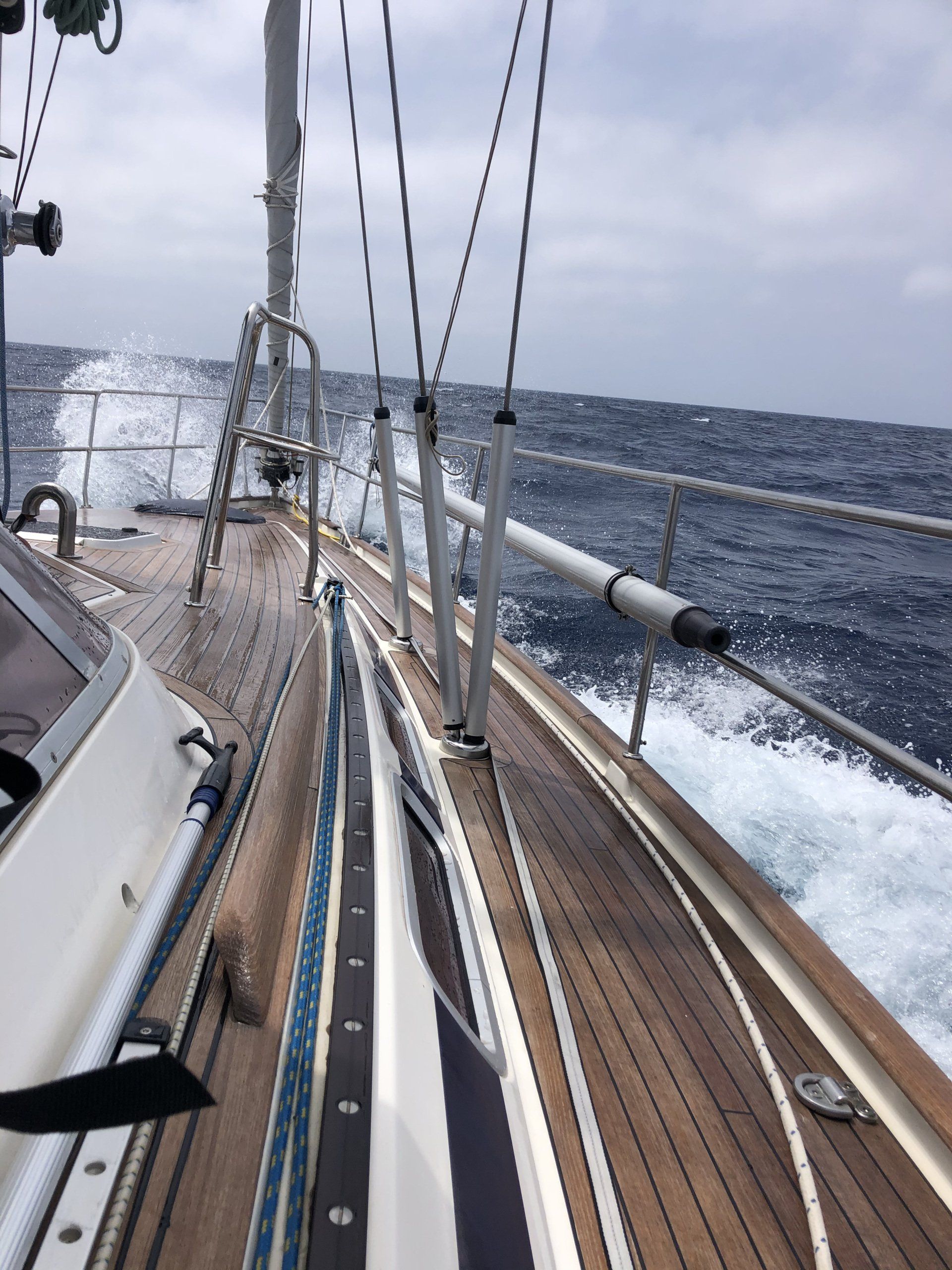 Wir überqueren die spanische Grenze. Wir besegeln ab jetzt spanische Gewässer. Ganz schön weit draussen noch. Die Welle wird anstrengend, es ist kaum noch eine Bewegung an Bord möglich. Die Sonne gibt alles, und wir haben das Bimini als Sonnenschutz leider nicht installiert. Bei der Welle aber auch keine Chance das zu ändern. Also Sonnenhut und lange Kleidung, die wir immer wieder nass machen. Spass ist anders. So langsam weiss ich nicht mehr wie und wo ich sitzen soll. Die zweite Nacht wird anstrengend- durch die immer höher werdende Welle von der Seite ist unten im Schiff ein Höllenlärm, alles kracht, scheppert und was noch kann fliegt durch die Gegend. Die Nacht schlafen wir beide kaum, es ist eher ein dämmern zwischen dem Versuch sich irgendwie festzuhalten.