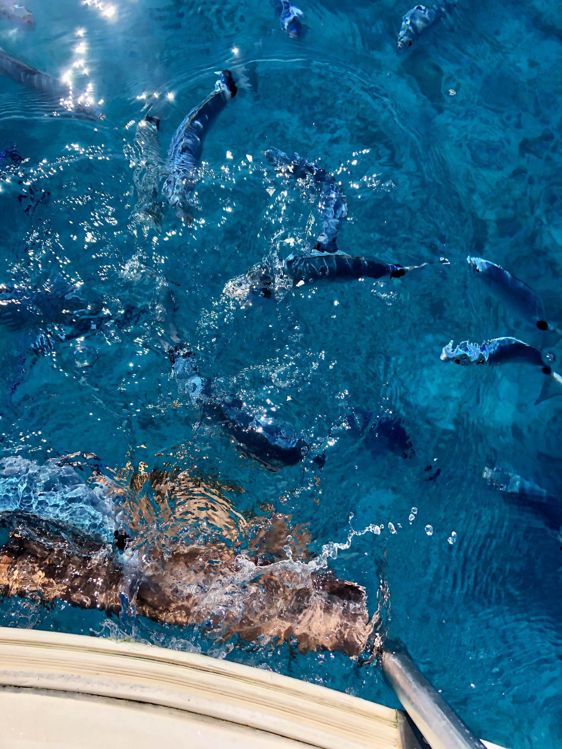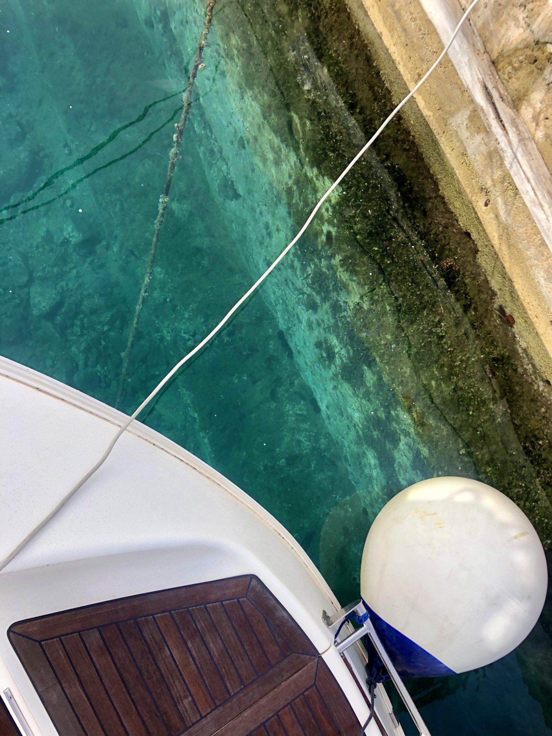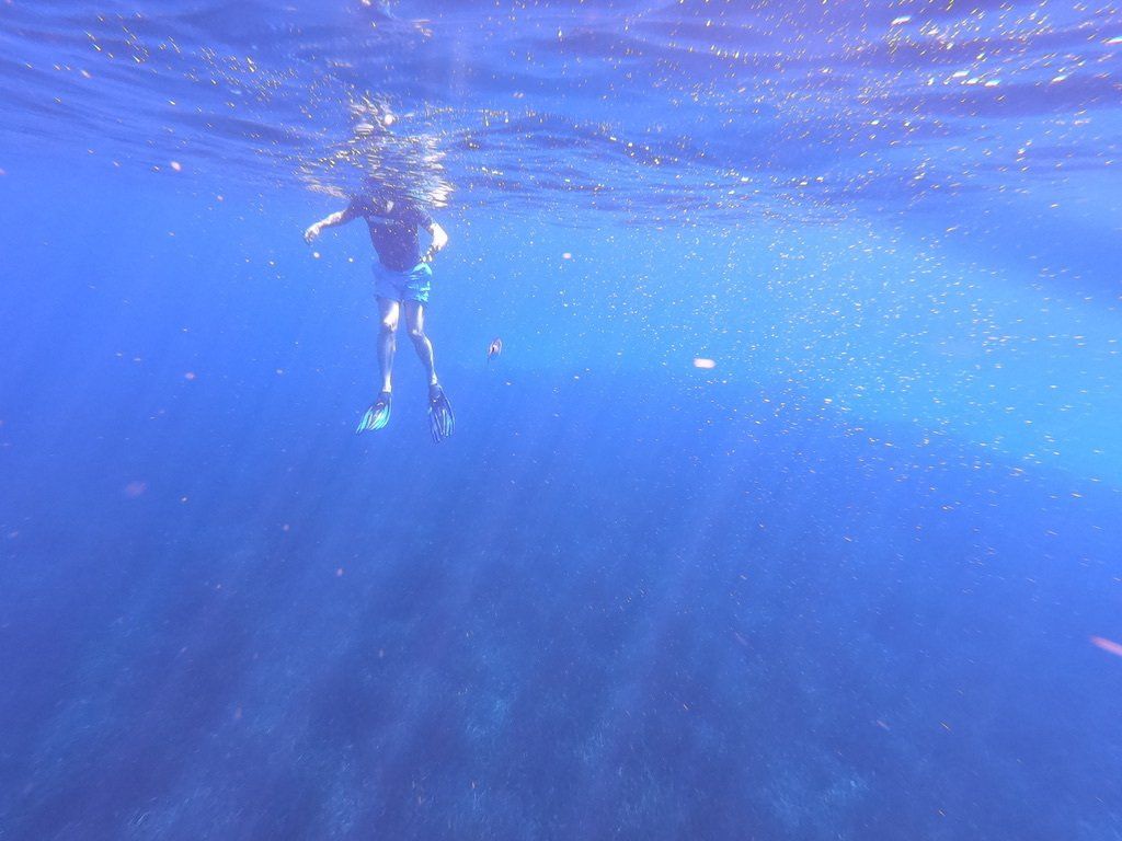 Das Wasser ist so klar, dass wir die Boje und die Kette darunter bis zum Boden auf 7 Meter Tiefe glasklar sehen können. Die Blue Baloo sieht ihren eigenen Schatten auf dem Boden und ich kann sogar meinen winkenden Arm sehen. Solche Bilder kenne ich sonst von Seglern auf den Bahamas. Wir schnorcheln durch die Bucht und es ist faszinierend wie viele Fische hier unterwegs sind, und neugierig auch recht nah kommen. Als wir vom Boot ein paar Brotkrumen ins Wasser werfen gibt es fast ein Gemetzel unter den Fischen.