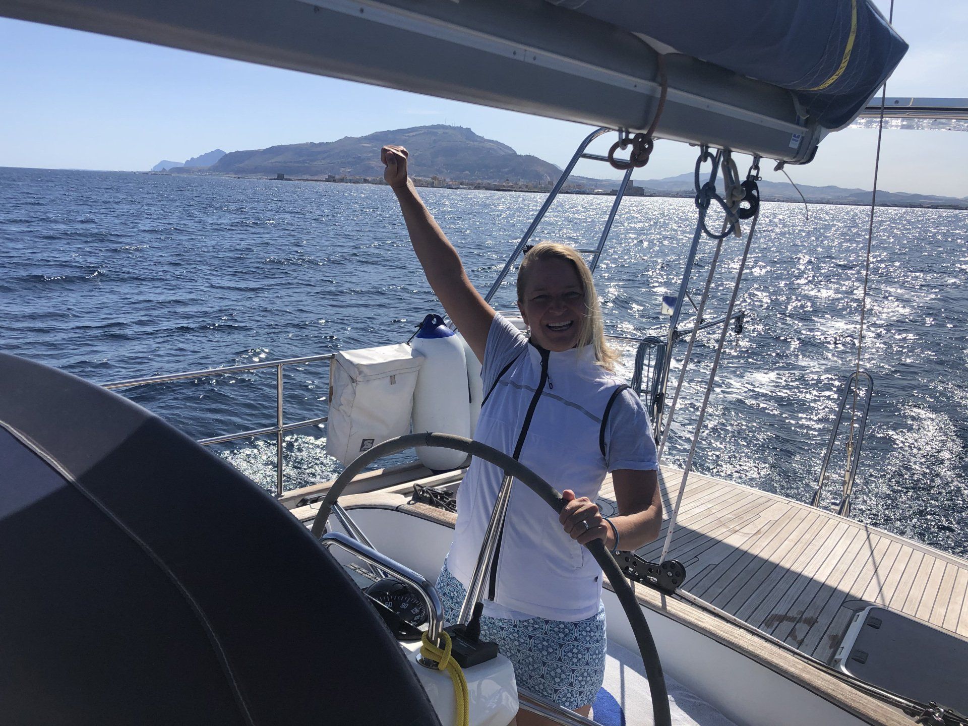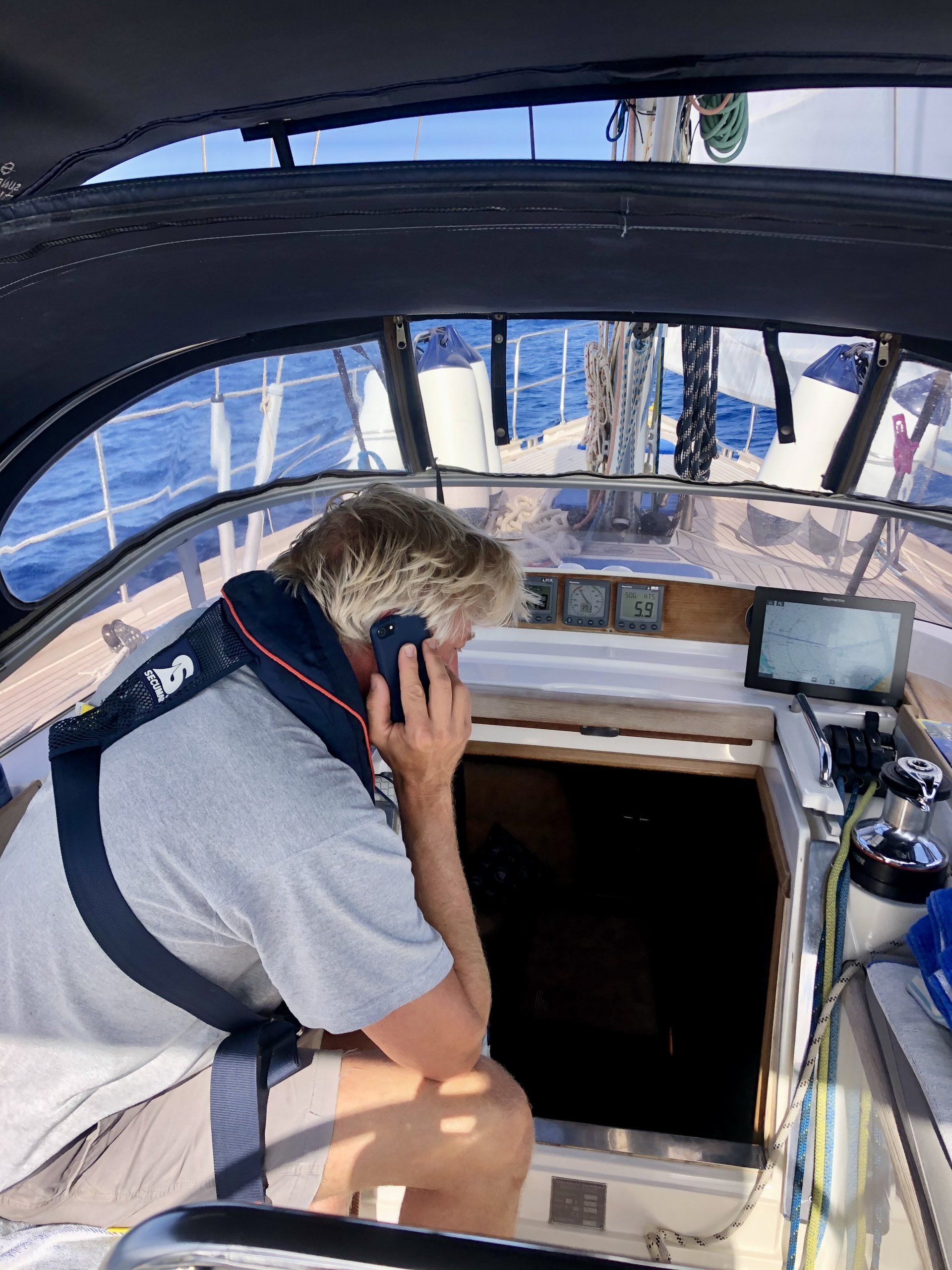 Interessant ist vielleicht noch die Rettungsweste, mit zugehöriger Sicherheitsleine zum Festhaken am Boot. Die Weste löst automatisch aus, sobald man im Wasser ist. Das geht über eine kleine Tablette, die den Auslösemechanismus blockiert. Dringt Wasser ein löst sich die Tablette auf, und die Gaspatrone bläst die Weste auf. Die Weste hat einen hohen Kragen und dreht einen immer auf den Rücken- somit ohnmachtssicher. Zusätzlich haben wir ein Licht eingebaut, dadurch leuchtet die Weste im Dunkeln. Außerdem eine sogenannte Sprayhood: Man kann ein Plastikschild über die Weste ziehen, so dass man zwar atmen kann, aber kein Wasser ans Gesicht kommt. Gerade bei Wellen wichtig. Und wichtigstes Feature: Unsere persönlichen MOB Melder (ManOverBoard), die ebenfalls in der Weste verbaut sind. Das sind Sendegeräte, die bei Aktivierung eine Alarmmeldung abgeben verbunden mit einer Positionsmeldung. Diese Meldung wird auf allen Schiffen im Umkreis angezeigt, und auch optisch und akustisch bei uns an Bord. Das ist natürlich eine extrem vereinfachte Erklärung. Zusammengefasst kann man sagen- bei uns fällt niemand von Bord, und wenn dann niemals unbemerkt.
