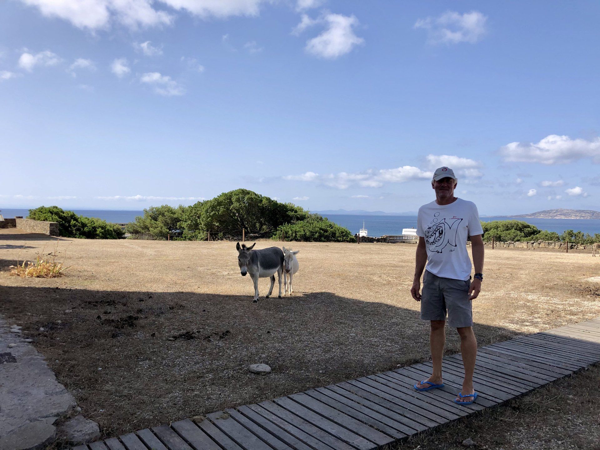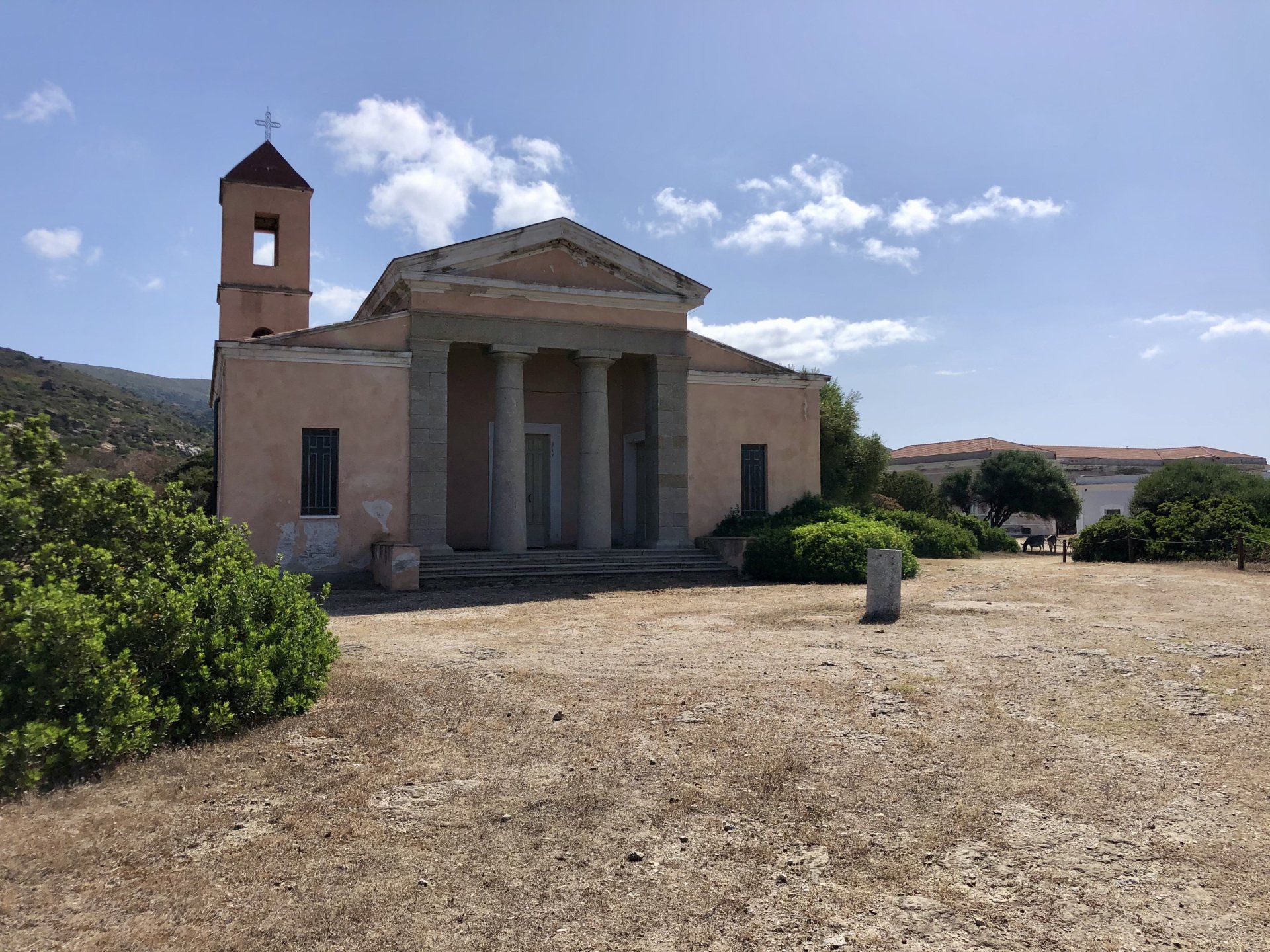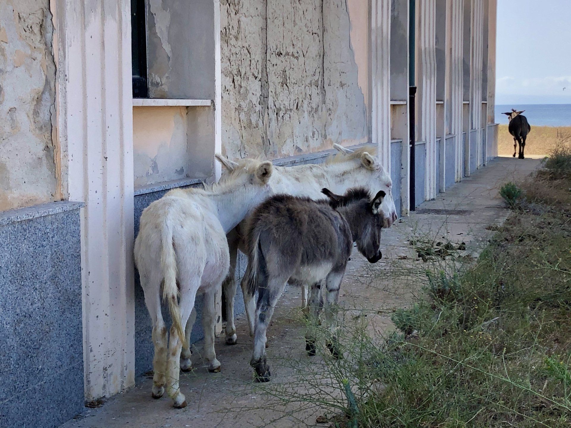 An Land sehen wir uns um, begegnen vielen der besagten Esel und sehen die alten Anlagen. Einmal täglich kommt eine Fähre an, die Ausflügler von Porto Torres bringt und abends wieder abholt. Man kann dann entweder zu Fuß auf den festgelegten Wegen, mit einem Fahrrad, oder wenn man Glück hat mit einem Elektroauto die Insel erkunden. Wir haben keins- selbst jetzt vor Saisonstart muss man die Elektroautos 4-5 Tage im Voraus reservieren. Das liegt auch daran, dass es nur drei gibt, und eins kaputt ist…Allerdings finden wir die Preise auch ganz schön erwachsen- 90 Euro für einen Tag. Ich hoffe einfach, dass da auch ein guter Teil Unterstützung für den Nationalpark dabei ist. Aber wir bekommen ja eh keins. Fürs Fahrrad fahren ist es einfach zu heiss, also laufen wir zu Fuß die Bucht ab, und schauen uns das Ganze dann wieder vom Schiff aus an. Es ist eine wunderbare Ruhe hier- keine Motoren, keine Beiboote, keine Jetskis, keine Autos. Um halb sechs holt die Fähre die Ausflügler wieder ab, dann kehrt totale Stille ein. Bis auf- ja genau- die Esel. Immer wieder hört man ihre Schreie. Das klingt teils aufgeregt, erbost, zornig, oder manchmal auch nach höchster Not. Und passiert zu jeder Tages und Nachtzeit. Internet sei Dank weiß ich jetzt- Stuten rufen so ihre Fohlen, und Hengste kommunizieren mit rossigen Stuten.