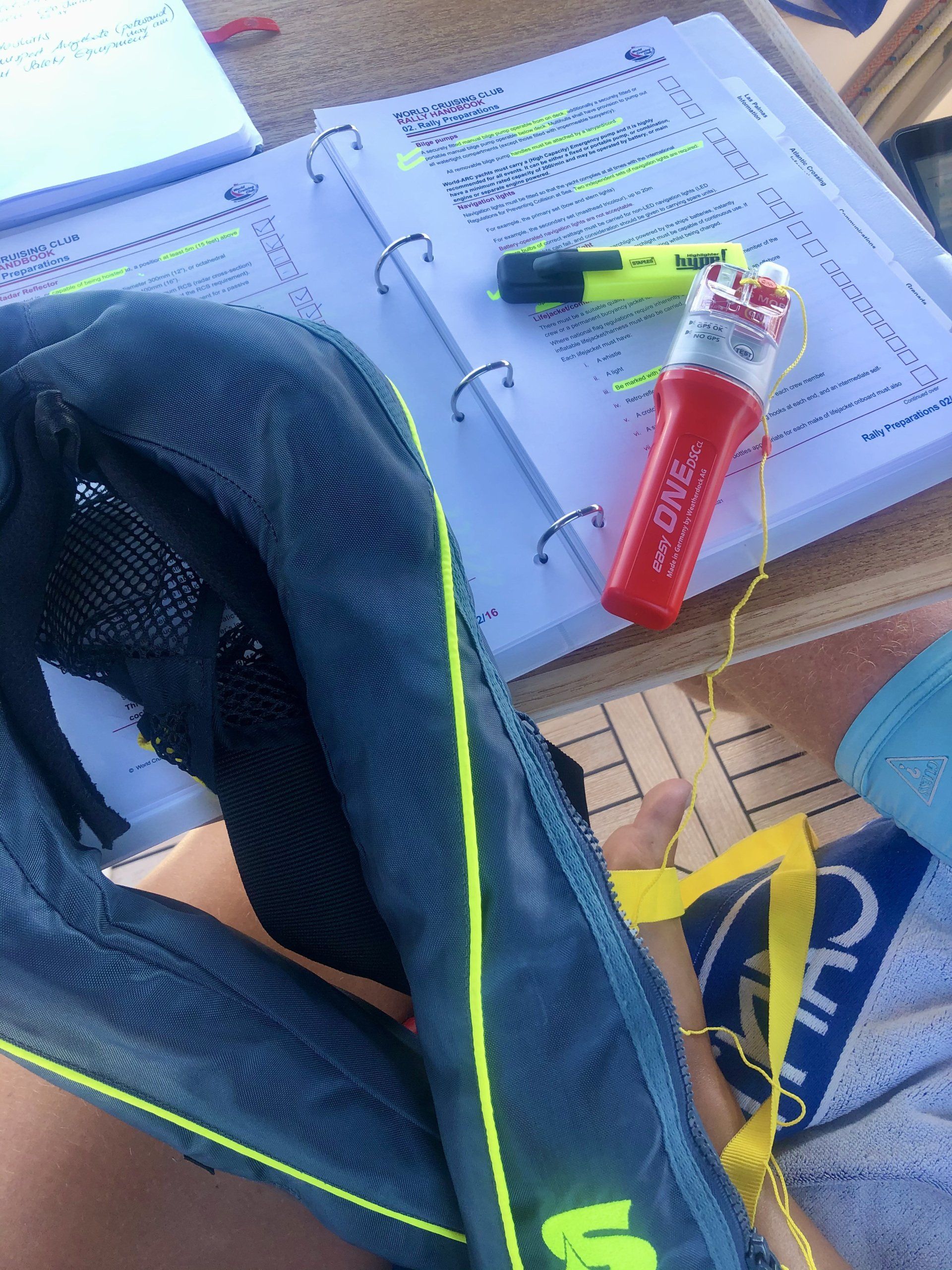 Aber dann klopft doch das schlechte Gewissen an: Wir haben seit einiger Zeit einen dicken weißen Ordner an Bord herumliegen- das gesammelte Wissen, aber auch die Anforderungen die an alle Teilnehmer der ARC- Atlantic Rally for Cruisers gestellt werden. Wie bei anderen Rallys auch starten mehrere Schiffe gleichzeitig von Las Palmas, Gran Canaria (in unserem Fall ca 100, die wie wir mit der ARC+ von Las Palmas über die Kap Verden nach Grenada wollen), werden über die Fahrtzeit getrackt, und es werden am Ende Sieger gekürt. Die Teilnahme an der ARC bedeutet für uns erhöhte Sicherheit bei unserer ersten Atlantiküberquerung Anfang November, das Siegertreppchen ist eher nicht unser Thema. Und im Rahmen der ARC gibt es für die teilnehmenden Boote und die Crew Anforderungen die zu erfüllen sind- sei es Sicherheitsausstattung, Sicherheitschecks, absolvierte Schulungen, Anmeldungen etc.