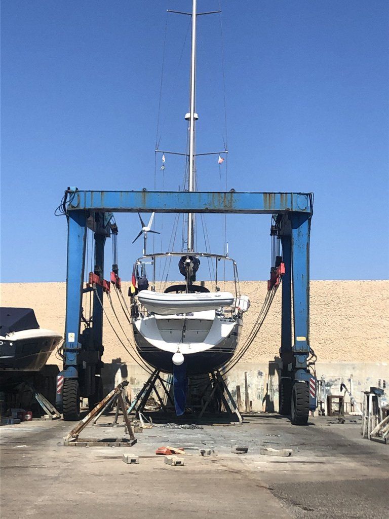 Also auf zum Travellift. Das bedeutet wir fahren mit der BB in ein rechteckiges Becken, der Travellift fährt quasi um uns herum, und schiebt zwei lange Schlaufen unter BBs Bauch. Diese werden dann hochgezogen und wir hängen. Wir haben eine kurze Diskussion über die Position der Bänder- sind die an der falschen Stelle reißen sie uns den Propeller ab, oder beschädigen anderes am Rumpf. Denn 11 Tonnen Schiffsgewicht sind nicht ohne und müssen gut austariert werden. Aber da sind klar definierte Hebepunkte und wir bestehen drauf dass diese auch eingehalten werden, auch wenn es dadurch etwas komplizierter wird, da der Travellift etwas kurz ist für uns. Deshalb lösen wir das Achterstag- das Stahlseil, das den Mast nach hinten zieht, und schon geht’s.