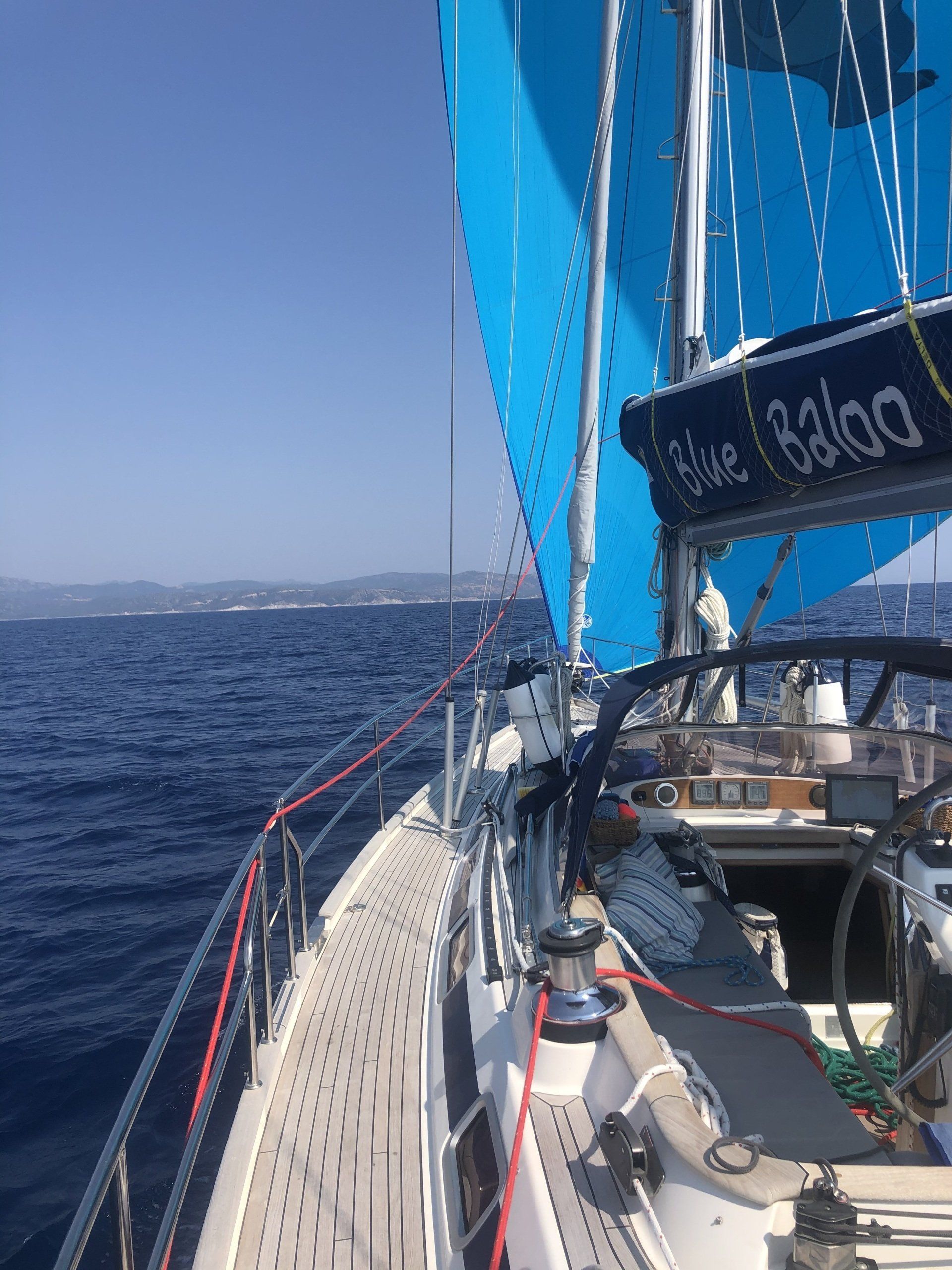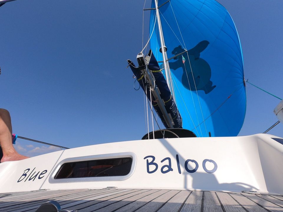 Schweren Herzens verlassen wir auch Porto Pino wieder, um nochmals Mafaltano einen Besuch abzustatten. Unsere Freunde von der IBEX wollen dort ebenfalls hin, und wir freuen uns sehr auf ein Wiedersehen nach fast 4 Monaten. Und diesmal können wir auf dem Weg nicht nur die Segel rausholen- nein, wir können sogar den Bären fliegen lassen. Heißt übersetzt: Der Wind kommt von schräg hinten und ist nicht zu stark (bis 15, 16 Knoten) und wir können den Gennaker (ein Leichtwindsegel für genau diesen Fall) setzen. Und da wir auf der Blue Baloo sind, steppt bei uns der Bär im Gennaker. Guido grinst einmal um seinen ganzen Kopf herum. Das erste Mal in der Saison dass wir den Bären rausholen können. Und bei 5 Knoten Wind machen wir damit 4,5 Knoten Fahrt. Das sind im Seglerleben Gänsehautmomente.