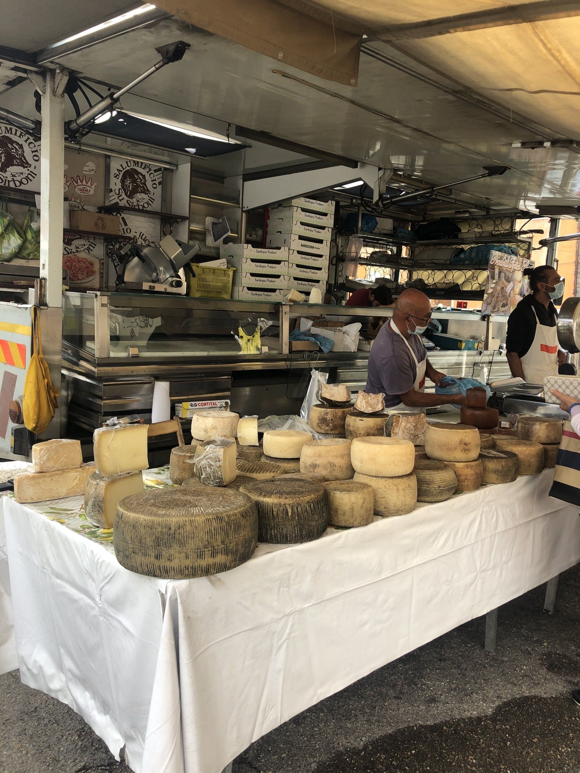 Donnerstag ist Markttag, da ist um die Markthalle außen rum viel los, und wir decken uns bis unter die Hutkrempe, bzw. den Süllrand mit Käse und Salami ein. Vor Ort eingeschweißt hält das auch eine Weile. Wenn wir es nicht vorher aufessen.