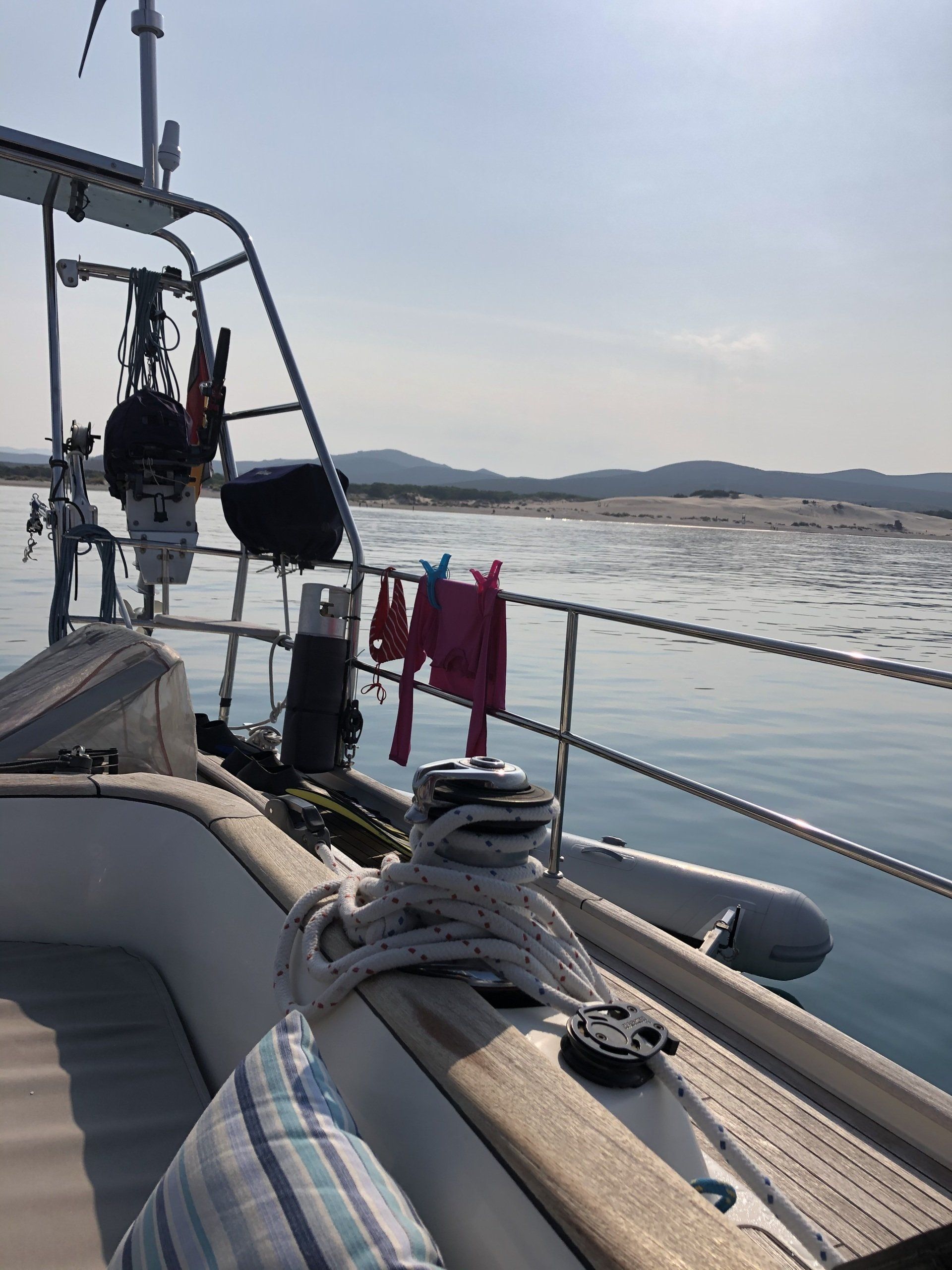 Also auf geht’s nach Porto Pino, dieser wunderbaren langen Bucht, mit weißen Dünen am Strand, grün bemoosten Hügeln im Hintergrund und kristallklarem türkisen Wasser unter BBs Bauch. Abends geht auch noch die Sonne am Rande der Bucht unter und färbt die weißen Dünen rosa. Da weiß ich gar nicht wie ich das beschreiben soll ohne endgültig völlig zu verkitschen. Wahrscheinlich eh zu spät. Ich lasse einfach ein paar Bilder sprechen.