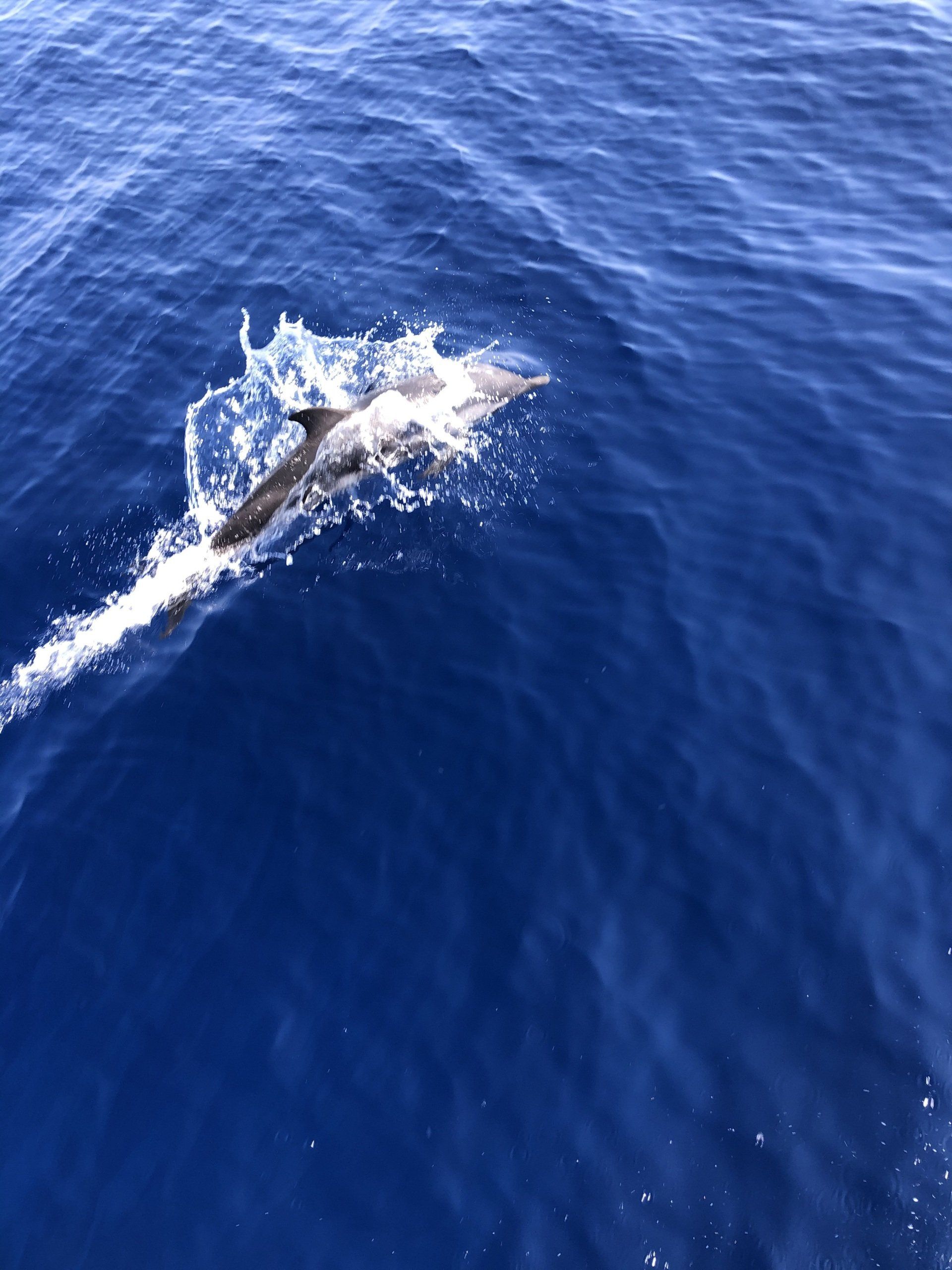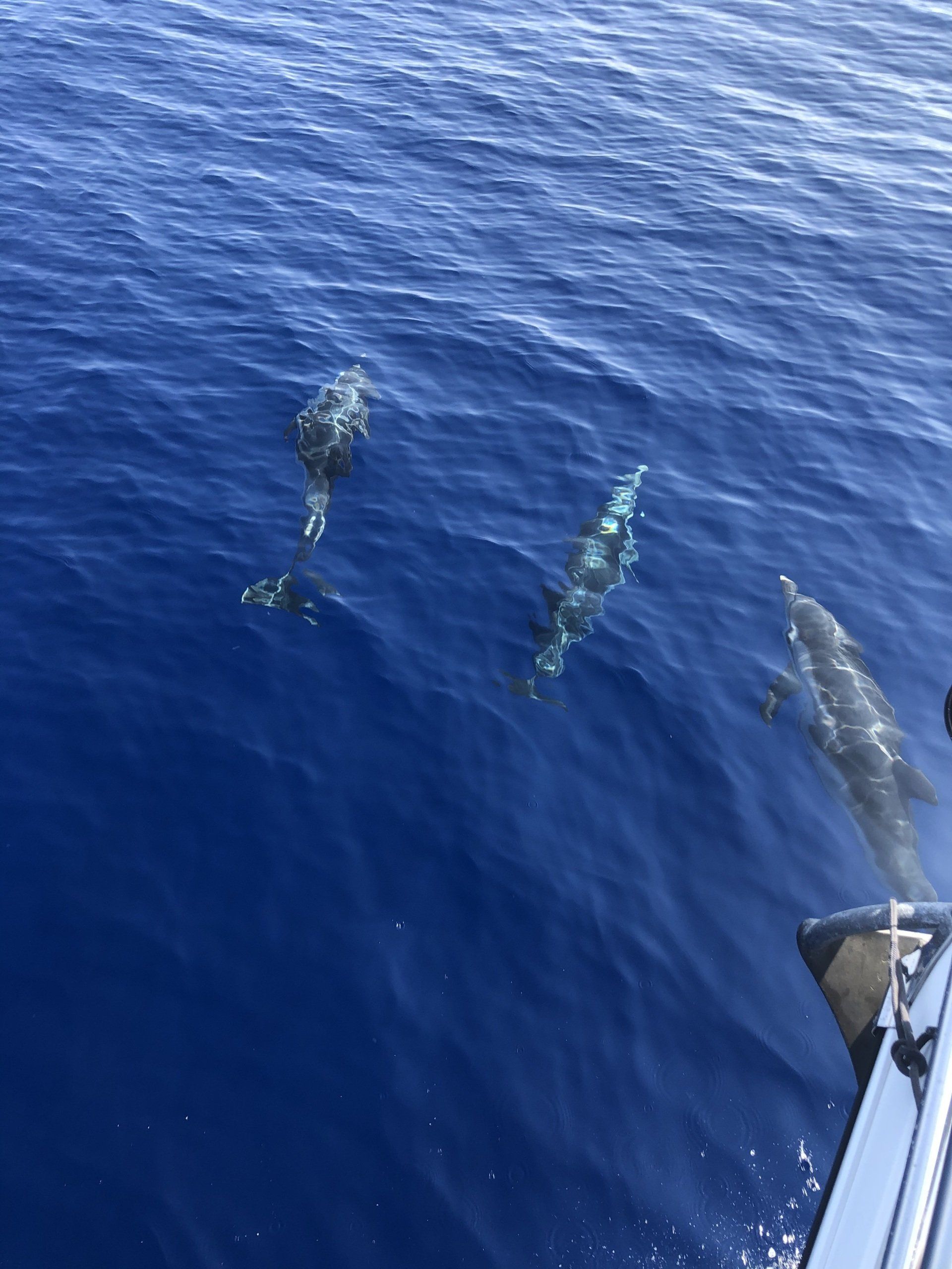 Und manchmal bekommt man kleine Grüße zurück- Delphine begleiten uns am Nachmittag eine Weile und schwimmen in der Bugwelle vorne mit. Es sind insgesamt vier Stück, die sich abwechseln, in der Welle surfen, springen. Der größte der vier dreht sich in der Bugwelle immer seitlich, so dass er uns anschaut – Neugierig sollen sie ja sein. Nach so einem Moment ist alles knarzen, Welle, etc erstmal vergessen, Delphine haben irgendwie die Fähigkeit einen glücklich zu machen.