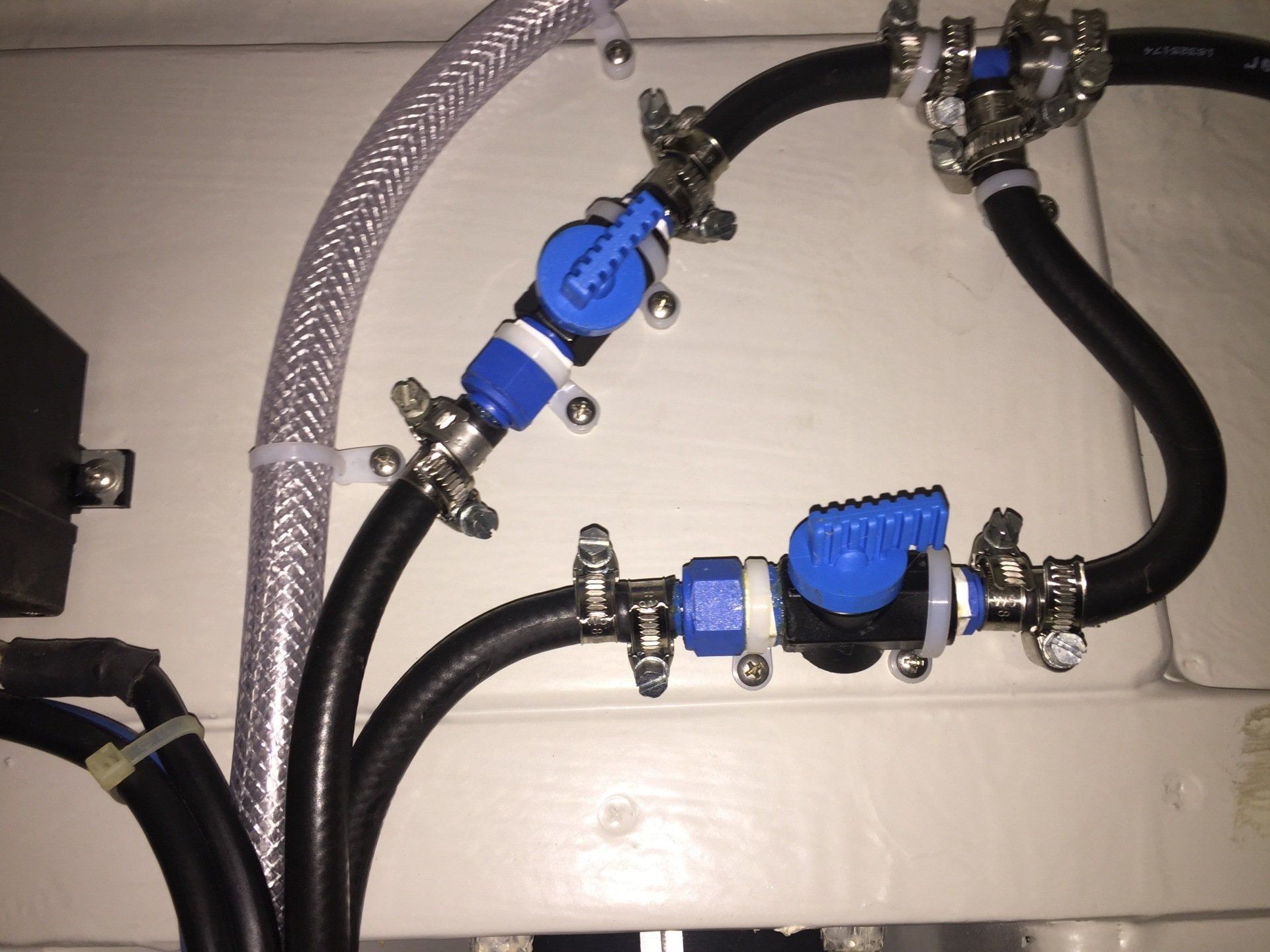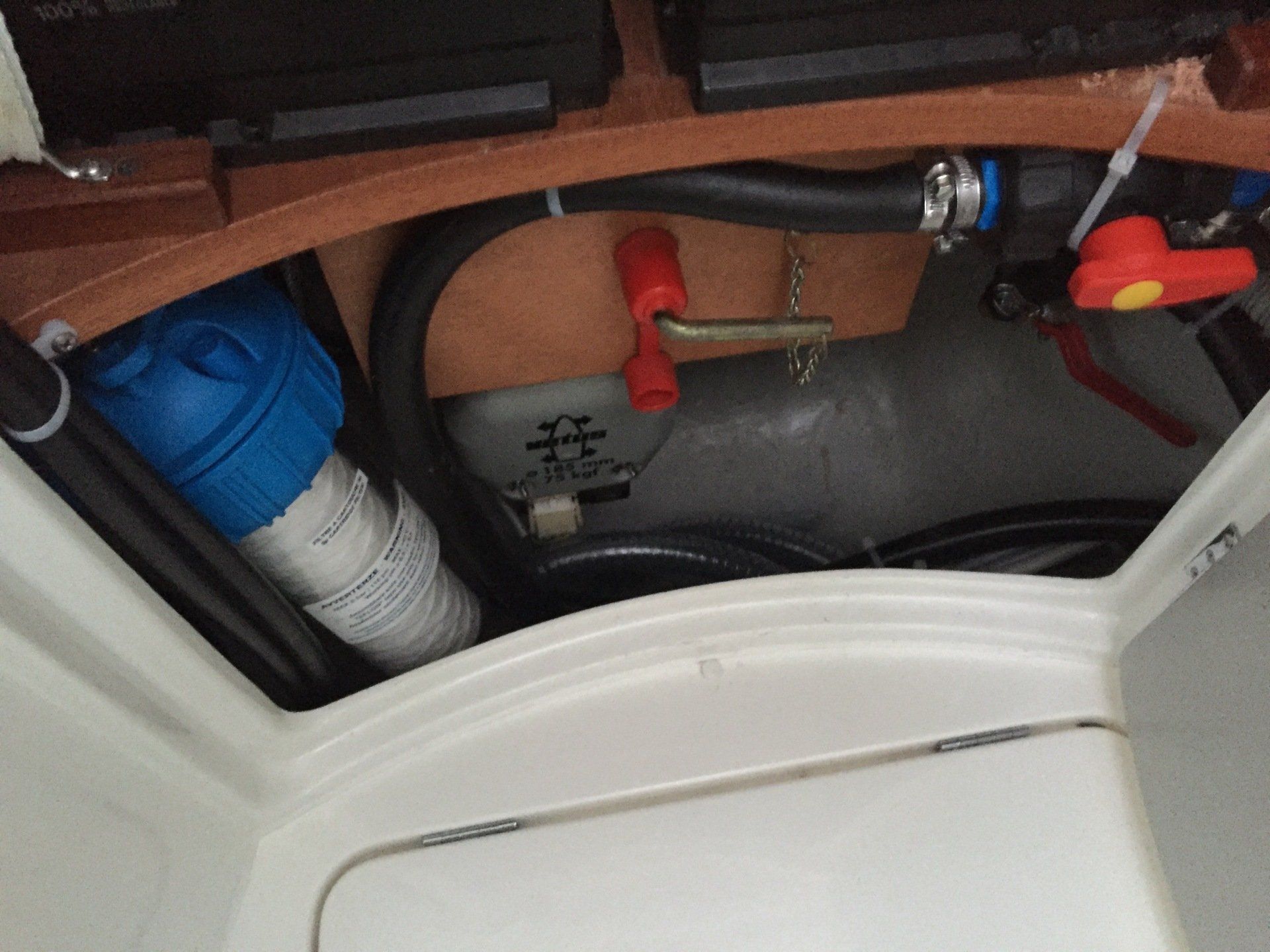 Die Bilder oben zeigen die Einbauorte mit Seewasserzufuhr, Feinfilter, Schalter, Tanksteuerung, Pumpe und dem Wassermacher selbst in einem Edelstahlrahmen im Vorschiff.